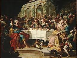 En Baltasar, de Gertrudis Gómez de Avellaneda, aparte de los presentimientos manifestados en I, 4 por Elda (y, en un aparte, por Rubén), lo más interesante se concentra en la parte final, con la escena del sacrílego banquete. En IV, 6 entra Elda «desmelenada, el vestido en desorden, y pintado en todo su aspecto el extravío de la razón» (acotación en la p. 241b); en efecto, ha perdido el juicio y se siente acosada por cien espectros, por «sangrientos / fantasmas»; además cree ver multitud de tumbas a su alrededor, todo el palacio como un vasto cementerio; en la escena octava se desata la tempestad, se abren puertas y ventanas, se apagan las luces, caen las estatuas y aparece en una pared la famosa inscripción «Mane, Thecel, Phares».