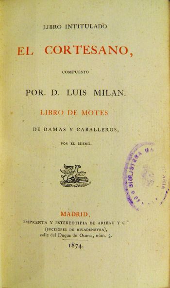 El cortesano, de Luis MilánLas relaciones entre nobleza y literatura durante la época de Lope de Vega son de enorme intensidad[1]. Es una sociedad refinada, suntuosa, que propicia la actividad artística y las exhibiciones espectaculares. Un ejemplo significativo, todavía en el siglo XVI, es el de la corte virreinal valenciana, inmersa en un ambiente poético, festivo y teatral, con influencias italianas, que se entretiene con fiestas, tertulias y academias literarias, certámenes y debates, danzas y máscaras, torneos y representaciones, como refleja, por ejemplo, El cortesano. Libro de motes de damas y caballeros de Luis Milán, publicado en la misma ciudad en 1561.