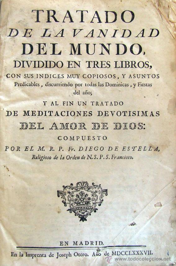 [3] El mejor conocedor de fray Diego es el P. Pío Sagüés Azcona, O.F.M., autor de Fray Diego de Estella (1524-1578): apuntes para una biografía crítica, Madrid, s. n. (Diputación Foral de Navarra), 1950 y editor de varias de sus obras. También puede consultarse la publicación conmemorativa Fray Diego de Estella y su IV Centenario, Barcelona, Imp. Elzeviriana, 1924, y las indicaciones de Antonio Pérez Goyena, Contribución de Navarra y de sus hijos a la Historia de la Sagrada Escritura, Pamplona, Imprenta de Jesús García, 1944, pp. 179-182. En fin, una semblanza divulgativa es la de Tomás Moral, Fray Diego de Estella, Pamplona, Diputación Foral de Navarra, 1971 (col. «Navarra: temas de cultura popular», núm. 113). La bibliografía debe completarse con las referencias a fray Diego por parte de los estudiosos de la espiritualidad española y la literatura mística franciscana (Andrés Martín, Bataillon, Cilveti, Gomis, Hatzfeld, Sainz Rodríguez…).