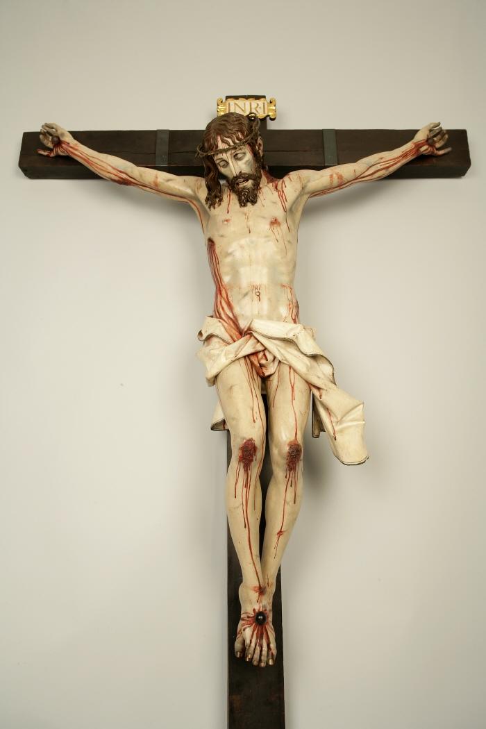 [7]tres clavos: durante la alta Edad Media (estilo románico), lo usual en la iconografía del Crucificado era mostrarlo clavado a la Cruz con cuatro clavos, dos para los manos —o muñecas— y dos para los pies, cada pie con un clavo diferente. En cambio, a partir del gótico se suele representar con tres clavos, haciendo que un pie esté sobre otro (lo que obliga a una pierna a doblarse de forma diferente a la otra y romper la simetría). Sea como sea, también en el Barroco siguen existiendo representaciones con cuatro clavos, tanto en la pintura (así el famoso «Cristo Crucificado» o «Cristo de San Plácido» de Velázquez, entre otros ejemplos) como en la imaginería.