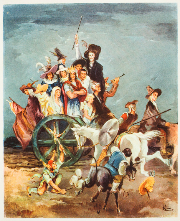 En la serie de entradas a la que doy comienzo hoy pretendo un acercamiento a dos episodios de la Segunda parte del Quijote —el del carro de las Cortes de la Muerte (II, 11) y el del retablo de maese Pedro (II, 25-26)— en los que burla, teatralidad y violencia se dan la mano. Obvio es decir que estos tres conceptos han dado mucho juego a la hora de analizar la novela cervantina y han generado una abundantísima bibliografía[1]. Sin embargo, ahora me interesa destacar la fuerte imbricación de esos tres conceptos en los dos episodios seleccionados. En ambas ocasiones don Quijote se va a ver enfrentado a sendas realidades del mundo teatral cotidianas en aquella época (una compañía de actores, un retablo de títeres), pero que en su caso van a ser interpretadas en clave caballeresca.